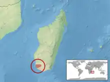 This gecko is one of many species endemic to the island of Madagascar, and is recorded from several areas in the extreme southwest of the country. This species is found on rock outcrops in dry forests with xeric vegetation, dominated by baobabs and similar trees. Initially it was known only from Itampolo and the type locality of Tsimanampetsotsa, but was already theorized to occur across most of the Mahafaly Plateau.[2] Later, it was also recorded from Vohombe and Efoetsy.[3] It is a lowland species, with all these localities between 20 and 160 meters (66 and 525 ft) in elevation, and it has a known extent of occurrence of 7,564 km2 (2,920 sq mi).[1] Because this species is readily observable and prone to habitat degradation, it may serve as an indicator of suitable locations for reptile conservation.[4]