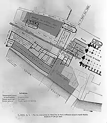 During the 1853 to 1870 renovation of Paris by Baron Haussmann, many buildings on the Île de la Cité were demolished, including all the buildings between the rue de la Cité and the rue d'Arcole. Between 1867 and 1878, the current Hôtel-Dieu building to the north of the square was built, and the hospital's old building to the south was demolished, at which point the parvis took on its current size and shape.[4] The expansion of the parvis was intended to better display Notre-Dame's architecture. Although the change was not without its drawbacks, as American authors Richard and Clara Winston noted "Something has been gained, something lost, by the creation of the vast open square in front. Distance diminishes size but provides a greater sense of the graciousness of the whole."[5]