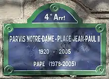 After the death of Pope John Paul II in 2005, it was proposed to rename the square to Place Jean-Paul II. The name was intended to memorialize the late pope's visit to the square in 1980, as well as his subsequent visit to Notre-Dame in 1997 for World Youth Day. The proposal was controversial, however, eventually resulting in the square's current compound name in 2006.[1]