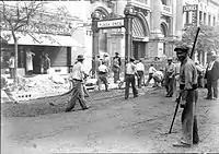 Road workers outside the entrance to the station (1938)