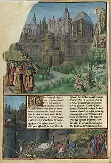 The Passages d'outremer is conserved in three 15th-century manuscripts, all today in the Bibliothèque nationale de France (BnF), numbers fr. 5594, fr. 2626 and fr. 4769. A partial edition was printed at Paris by Michel Le Noir in 1518 under the title Les passaiges d'Oultremer faitz par les Françoys.[1] The manuscript BnF fr. 5594 is a masterpiece of manuscript illumination by Jean Colombe, containing 66 full-page miniatures.[3] It was finished after 1488, since it contains a copy of a letter from the Ottoman sultan Bayezid II to King Charles VIII of France dated to that year.[4]
