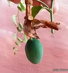 Passiflora glandulosa have cauliflorous inflorescence, meaning the flowers grow directly from the plant's woody stems instead of from new shoots.[5] Its petals are red or scarlet in color. The filament has both an external and internal component: the internal region ranges from 2–5 mm (0.079–0.197 in) long and is attached at its base. On the other hand, the external filament is awl-shaped and 100 mm (3.9 in) long, with a white to slightly pink color.[4] As depicted below, fruit of the wild passion fruit has an ovoid shape. Fruits are high in vitamin C.[6] As an indehiscent fruit, seeds are normally contained within the fruit unless disturbed by predation or decomposition.[2] Passiflora glandulosa seeds are typically 4 mm × 8 mm (0.16 in × 0.31 in), obovate in shape, and reticulated.[4]