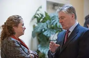 Kenny supported Miriam O'Callaghan when she came under fire from Sinn Féin for challenging Martin McGuinness of his past misdeeds during the 2011 presidential election campaign in a Prime Time debate, saying "I wouldn't criticise Miriam for doing what she did".[30] Kenny was also critical of Seán Gallagher after the presidential candidate objected to a tweet Kenny read out on The Frontline days before the 2011 election. Kenny told Gallagher to get over Tweetgate and get back to what he was "supposed to be good at"—creating jobs, and said he was "judged by the public not to be worthy."[31]