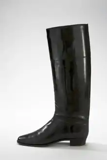 In the British fashion trends of the 1960s, shoes, boots, and handbags were often made of patent leather or vinyl. Patent shoes were available in black, yellow, green, orange, hot pink, white, blue and red.[9] Modern patent leather is typically made with a plastic or synthetic coating, resulting in an even glossier and more durable finish. This has also allowed for more versatility in the colors and patterns available, extending the range of applications for this luxurious material.[10]