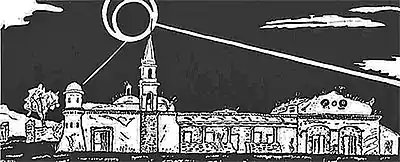 Hacienda de Mediñero, Jalisco, Mexico. Main hacienda residence; one-room school was located in the right wing of residence. Pen-and-ink illustration by Paul Alexander Bartlett, from Bartlett's The Haciendas of Mexico: An Artist's Record. University Press of Colorado (1990); Project Gutenberg edition