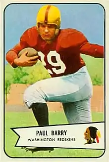 Paul F. Barry (August 7, 1926 – December 28, 2014) was an American football running back in the National Football League for the Los Angeles Rams, Washington Redskins, and Chicago Cardinals. He played college football at the University of Tulsa[1] and was drafted in the thirteenth round of the 1949 NFL Draft.