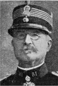 The French commander in Morocco, General Albert d'Amade, praised Diou's actions there stating that he "took part in almost all the engagements of the historic campaign in Casablanca and the outlying regions" and that he was sure to set an "example of calm and constancy of duty" in his new post.[3] He left for France on 3 May 1908 and was appointed an officer of the Legion of Honour on 12 July 1910.[1] Diou was appointed acting commander of the 63rd Infantry Brigade at Narbonne on 22 June 1912, receiving command of the 62nd Infantry Regiment two days later and of the 86th Infantry Regiment on 24 September. Diou's command of the brigade was confirmed on 21 December when he was appointed général de brigade.[2][7] Diou was also appointed military commander of the Narbonne and Perpignan military subdivisions.[7]