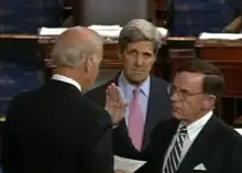 On January 19, 2010, Scott Brown, a Republican state senator, was elected to serve the balance of Kennedy's term. Although Kirk was only appointed until his successor was elected,[39] he continued to sit, and voted on the Senate floor on January 20, 2010,[40] without any objection from Senate staff or Senate Republicans. This situation is analogous to 1993, when Kay Bailey Hutchison was elected on June 5, but Bob Krueger continued to hold the seat until she took the oath of office on June 14, but was different from when Ted Kennedy was allowed to be sworn into office the day after his special election to the Senate in 1962.[41][42] Kirk was present at his successor's swearing in ceremony on February 4, 2010.