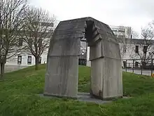 "Breath", of 2009–2011, was commissioned by Norwich City Council as a companion piece to the Norwich War Memorial, designed by Edwin Lutyens. The memorial was turned round and "Breath" was installed in the resulting space in the memorial gardens. It is a bronze sculpture, height 2.63 metres (8 ft 8 in); a central slab, relating to Lutyens' stone of remembrance, is flanked by leaves which suggest growth. The inscription reads: "The living honour the dead, only a breath divides them". De Monchaux said: "In a place like this, which is all about contemplation and thinking, it seems both life and death should be referred to".[12][13][14]