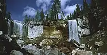 Paulina Creek Falls is a cascade and plunge waterfall from a streambed draining from Paulina Lake in Newberry National Volcanic Monument, south of Bend, Oregon. The waterfall is notable for its side-by-side drop of 80 feet (24 m) that surrounds a small island at the edge of the cliff.[1][2]