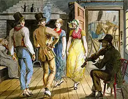 "Merrymaking at a Wayside Inn", depicts travelers grabbing a hurried and impromptu dance on the road in early 1810s America (in rural Pennsylvania), and shows practices which would have been considered inelegant or shockingly informal in many socially genteel circles in Europe at the time (such as smoking in the presence of ladies, smoking indoors, a man taking off his tailcoat in the presence of ladies—leaving him wearing only his waistcoat and shirt on top—and holding onto one's horsewhip while dancing). Only one of the women has bothered to take off her bonnet. One of the dancing men isn't wearing socks/stockings.