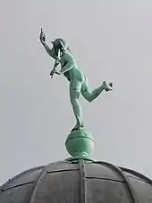 From 1890 to 1930, the Borough Engineer of Torbay, Henry Augustus Garrett, laid out the Princess Gardens, the Terrace Walk, Pier Pavilion and Torquay Pavilion on Torquay seafront. The Pavilion's architect was Edward Rogers, who drew up the final plans with HC Goss. The plans were passed in 1903, but construction did not start until 1911 due to Rogers’ death, and the work was taken over by Garrett. Part of its site is on land reclaimed from the sea, and it was built on a concrete raft on which a steel framework was erected. It is faced with white tiles made of Doulton's Carrara-enamelled stoneware. Its central copper-covered dome is topped with a life-size figure of Britannia and two smaller domes on each side bear figures of Mercury. Finely sculpted Art Nouveau-style cast iron edges the steps to the promenade deck and the octagonal bandstands or summer houses.[1]