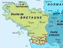 The Pays de Retz (French pronunciation: [pei də ʁɛ]; Breton: Bro-Raez; lit. 'Land of Retz') is a historical subregion of France that currently forms part of the Loire-Atlantique department, but once formed part of the Duchy of Brittany.
