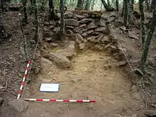 Excavation areas 2 and 3, on the second tell between the top-hill wall and the interior wall, had unearthed housing materials and structures related with three different periods of occupation of the settlement. The most ancient dwelling belongs to a period just before the 2nd Iron Age, so before the 6th century BC, because the level was discovered under pieces of metalworking clearly identified as materials from the transitional period between the 1st and the 2nd Iron Age. This first and the most ancient dwelling so far is defined by an ashen level where remains of wooden structures, grain store pits, plinth stones and a depot of burnt nuts (hazelnuts and acorns). An intermediate period of dwelling is located just above, this is the best studied and the most known period because it is the widest layer discovered so far. It is a hut-like structure with a uniform ground prepared to be dwelt and furnish with the basic Iron Age housing elements: Pit holes to support the structure, millstones, hand-mills, metalworking (bronze), remains of a bonfire, grain store pits and pieces of pottery. The chronology of this period is between the 6th century BC and the 2nd half to the 2nd Iron Age. More than 30 centimetres above, a third and more recent layer was discovered with a clear interruption in dwelling. This third and recent is belonging to the late 2nd Iron Age. This is a period identified by pieces of pottery but no structures were found in it. No Roman remains were found in the site so far so the settlement was probably abandoned (or not romanised) after the 1st century BC, in favour of other close sites as the gold mines of Los Corralones, Santo Toribio Hill or the valley of Vidriales (Eastwards into the plateau)