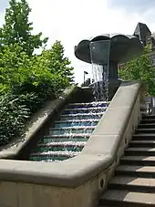 The site contains several memorials for citizens of Sheffield who served in wars, including in the Spanish Civil War and another plaque commemorating Sheffielders who gave their lives in all conflicts, including the Korean War. It also contains a memorial to Hiroshima, unveiled on Hiroshima Day, 8 August 1985, in the presence of three survivors of the atomic devastation.[5] Other memorials include the Holberry Cascades, named for local Chartist leader Samuel Holberry, the Bochum Bell, donated by Sheffield's German twin city Bochum, and a set of standard measures.[2] The measures had previously been located by a wall alongside St Paul's Parade, just outside the Peace Gardens.