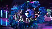 In November, Perry also performed "Peacock" at New York's Roseland Ballroom, where she introduced herself by popping out of a giant cake, dressed in a purple skin-tight cupcake print dress.[28] Additionally, Perry included "Peacock" in her setlist for her worldwide concert tour, California Dreams Tour (February 2011 – January 2012). When singing the song, the performance would include an elaborated feathered fan dance number. She wore a turquoise/green one-piece swimsuit with a peacock tail attached accompanied by female dancers dressed in a similar way, two male dancers and mimes. Concert reviewer Jim Abbott for the Orlando Sentinel felt that detailed performances such as the ones done for "Peacock" were a highlight for the singer's tour.[29]