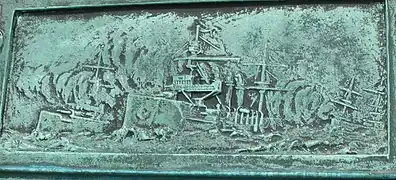 The statue stands on a square granite plinth, mounted on three granite steps. Each side of the plinth bears a bronze plaque which together list the names of the 445 staff of the Pearl Assurance Company that were killed in action in the First World War, and an inscription "THEY PASSED AWAY IN THE DAYS / OF THEIR STRENGTH, THEY / LIVE FOREVER IN THE UNDYING / FACT OF THEIR SACRIFICE". Just above each plaque is a small rectangular decorative bronze plaque: two in low relief showing warships (west) or aircraft (east), and two in high relief (north and south) showing with a helmet surrounded by a wreath.