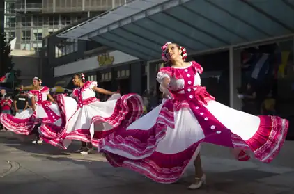 Performers from Ballet Folklorico Sones Mexicanos dance at the Iowa City Latino Fest in the Ped Mall on August 26, 2023.