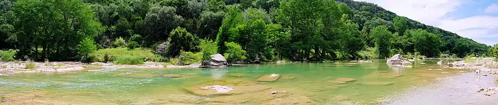 The Pedernales River (/ˌpɜːrdəˈnælɪs/ PUR-də-NAL-iss) is a tributary of the Colorado River, approximately 106 miles (171 km) long, in Central Texas in the United States.[2] It drains an area of the Edwards Plateau, flowing west to east across the Texas Hill Country west of Austin. The name "Pedernales", first used in the middle 18th century, comes from a Spanish word for the flint rocks characteristic of the riverbed.