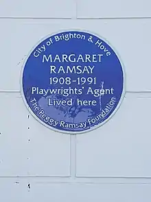 The Peggy Ramsay Foundation has been established by her estate and makes grants and awards to help writers and writing for the stage.[10] Her archive has been donated to the British Library.[11] In 2009, a blue plaque was unveiled at Ramsay's former home in Kensington Place, Brighton by her friend and biographer Simon Callow.[12]