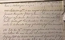 Photo of page in Schuyler family Bible noting Peggy Schuyler's birth. Notation is in Dutch: the English translation of the relevant portion is "1758 19th September- Margaret- Lord Give her peace on Earth & everlasting Glory".