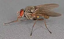 Pegomya winthemi is a species of fly in the family Anthomyiidae. Found in North America, it was first described as Anthomyia winthemi in 1829 by Johann Wilhelm Meigen. The insect measures 4.25–5 mm long.[1] Its pedipalps are infuscated (darkened with a brownish tinge) apically; the anterior lateral angles of the thorax and scutellum are yellowish red. The longest hairs of the arista are a little longer than its basal diameter, while the lower calyptra (small membranes above the halteres) are distinctly protruded. The scutellum is almost bare on the disc. The posthumeral bristle is not duplicated, and the area between the posthumeral and the margin of thorax is almost bare.[2]