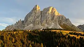 The Peitlerkofel (Ladin: Sas de Pütia, Italian: Sass de Putia) is a mountain of the Dolomites in South Tyrol, Italy. A solitary mountain, it stands between Val Badia to the east and the Villnöß valley to the west, in the very north of the Dolomites. It boasts two distinct summits, the Grosser Peitler (2875m) and the Kleiner Peitler (2813m), which are divided by a deep ridge.[2]