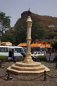 The Pelourinho (Portuguese for "pillory") is an important monument in the city of Cidade Velha in the south of Santiago, Cape Verde. The historic centre of Cidade Velha is an UNESCO World Heritage Site since June 2009.[1] It is a white marble column in Manueline style, standing at the main square of the town. It was a symbol of municipal power, and of slavery: rebellious slaves were punished publicly at the pelourinho.[2]