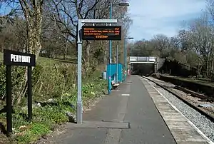 Pen-y-Bont railway station is a railway station serving the village of Penybont, in mid Wales. It is situated on the Heart of Wales Line 48+12 miles (78.1 km) south west of Shrewsbury. The station is located closer to the villages of Crossgates and Fron than it is to Penybont itself. It is now the closest station to the town of Rhayader, about 9 miles to the west.