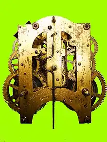 The mechanism which runs a mechanical clock is called the movement. The movements of all mechanical pendulum clocks have these five parts:[25]