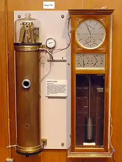 During the Industrial Revolution, the faster pace of life and scheduling of shifts and public transportation like trains depended on the more accurate timekeeping made possible by the pendulum.[3]: p.624 Daily life was organized around the home pendulum clock. More accurate pendulum clocks, called regulators, were installed in places of business and railroad stations and used to schedule work and set other clocks. The need for extremely accurate timekeeping in celestial navigation to determine longitude on ships during long sea voyages drove the development of the most accurate pendulum clocks, called astronomical regulators. These precision instruments, installed in clock vaults in naval observatories and kept accurate within a fraction of a second by observation of star transits overhead, were used to set marine chronometers on naval and commercial vessels. Beginning in the 19th century, astronomical regulators in naval observatories served as primary standards for national time distribution services that distributed time signals over telegraph wires.[13] From 1909, US National Bureau of Standards (now NIST) based the US time standard on Riefler pendulum clocks, accurate to about 10 milliseconds per day. In 1929 it switched to the Shortt-Synchronome free pendulum clock before phasing in quartz standards in the 1930s.[14] [15] With an error of less than one second per year, the Shortt was the most accurate commercially produced pendulum clock.[16][17][18][19][20]