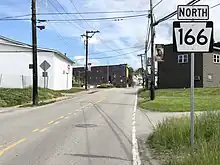 Upon crossing back into German Township, PA 166 comes to an interchange with PA 21, at which point the route heads northeast to form a concurrency with PA 21 on four-lane divided McClellandtown Road. The two routes head through a mix of farmland and woodland with some commercial development, passing through Lardin. PA 166 splits from PA 21 by heading north on two-lane undivided Edenborn Road into wooded areas. The route passes through the residential community of Edenborn before continuing north through forested areas with some homes on Ball Hill Road. PA 166 enters more wooded surroundings as it continues further north along Hartley Hill Road. Upon reaching the community of Hibbs, the road enters Redstone Township and becomes Thompson 1 Road, heading north through a mix of farmland and woodland with some homes. After passing the Thompson No. 1 mine, PA 166 continues into forests, becoming Tower Hill Road as it crosses into Luzerne Township. The road heads back into Redstone Township and passes through the residential community of Republic. Entering a patch of woods, the route crosses into Luzerne Township again and becomes Thornton Road as it serves the community of Allison. PA 166 heads into Redstone Township for a third time and heads through forested areas with a few homes, passing over the PA 43 toll freeway. The route turns northeast into a commercial area and intersects US 40 Business, becoming four-lane divided Grindstone Road. A short distance later, PA 166 comes to its northern terminus at an intersection with US 40.[1][2]