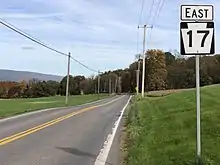 Pennsylvania Route 17 (PA 17) is a state highway located entirely in Perry County, Pennsylvania. The route is 35.7 miles (57.5 km) long and is signed east and west. The western terminus of the route is at PA 274 in Blain. The eastern terminus is at U.S. Route 11 (US 11)/US 15 in Liverpool. PA 17 is a two-lane undivided road that runs through agricultural valleys in the northern part of Perry County. The route heads northeast from Blain and intersects PA 850 in Kistler and PA 74 in Ickesburg. PA 17 crosses the Juniata River into Millerstown, where it has indirect access to the US 22/US 322 freeway. From here, the route continues east and intersects PA 235 before it comes to its terminus in Liverpool. PA 17 was designated in 1928 to run from US 22 (Market Street) in Millerstown east to US 11 in Liverpool while PA 74 was designated onto the section of road between Ickesburg and Millerstown. In the 1930s, PA 17 was extended southwest from Millerstown to PA 274 in Blain, replacing the portion of PA 74 between Ickesburg and Millerstown.