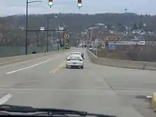 The route curves south into forested areas, turning east to head away from the river and railroad lines and pass through the residential community of Rock Point. PA 288 runs between homes to the north and woods to the south, heading into the borough of Ellwood City. Here, the route comes to an intersection with PA 65 and turns south to form a concurrency with that route on 5th Street, crossing the Connoquenessing Creek. The two routes head into residential and commercial areas, turning east onto Fountain Avenue. PA 65/PA 288 turns south onto 2nd Street, with PA 488 continuing east on Fountain Avenue. The road heads south through residential areas, passing over the P&W Subdivision line as a two-lane divided highway before becoming undivided again intersecting the eastern terminus of PA 351. Following this, the two routes head into industrial areas.[1][2]