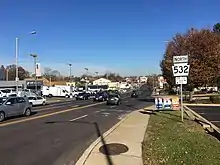 At this point, PA 532 turns northwest and joins PA 332/PA 413 on the four-lane divided Newtown Bypass, with Sycamore Street continuing northeast into the borough of Newtown. The bypass turns north and passes through wooded areas with nearby residential development. PA 332 splits from the Newtown Bypass by heading west on Richboro Road while PA 413/PA 532 continue to the north on the bypass. The roadway passes over an access road to Council Rock High School North before it heads to the east of Tyler State Park, curving to the northwest. At the entrance to the park, PA 413/PA 532 turn northeast to remain on the Newtown Bypass while Swamp Road heads to the northwest. The road passes between a residential development to the northwest and a shopping center to the southeast before the Newtown Bypass ends at an intersection with Durham Road, at which point PA 413 heads north on Durham Road and PA 532 heads east on Durham Road. The route narrows to a two-lane undivided road and comes to another intersection with Sycamore Street.[2][4]