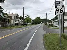 From here, the road passes more residences before becoming the border between Napier Township to the west and Schellsburg to the east. PA 96 fully enters Napier Township again and passes through a mix of woodland and farmland with a few homes as Cortland Road. The road curves northwest and then north again through the countryside, coming to the borough of New Paris. In this borough, the route passes several homes. Crossing back into Napier Township, PA 96 passes through more agricultural areas with some woods and homes. Entering West St. Clair Township, the road passes through more rural areas of farms and woods with a few residences. The route crosses into the borough of Pleasantville, where it comes to a junction with PA 56 in a commercial area. After this, PA 96 becomes King St. Clair Road and crosses back into West St. Clair Township and passes open farmland with some rural homes. The route makes a turn to the east before curving northeast through agricultural areas with some woods and residences, heading into King Township. PA 96 bends to the north and continues to its northern terminus at an intersection with PA 869 in Lincoln Township, with the road continuing north as part of that route.[2][3]
