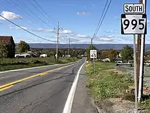 When routes were legislated in Pennsylvania in 1911, what is now PA 995 was not given a number.[4] PA 995 was designated in 1928 to run from Williamson northeast to US 30 west of Chambersburg along an unpaved road.[5] The road between PA 16 in Upton and Williamson was an unnumbered, unpaved road by 1930.[6] In 1937, PA 995 was extended southwest from Williamson to PA 75 in Claylick, following its current alignment.[7][8] The entire length of the route was paved in the 1930s.[8]