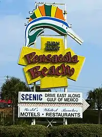 Another historical landmark is the vintage Pensacola Beach Sign just outside Pensacola Beach in Gulf Breeze. It was a 60s-era neon sign that directs drivers towards Pensacola Beach's "scenic" views of the coast of the Gulf of Mexico, as well as towards its white sand beaches, motels, and restaurants.[38] The sign was renovated in 2019 to look exactly like the old sign but feature LED lights instead of neon.[39][40]