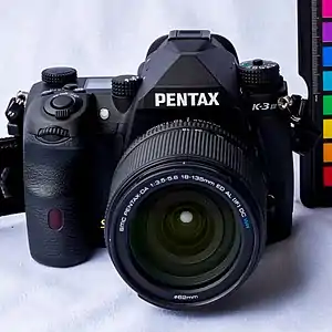 The Pentax K-3 Mark III is a Digital single-lens reflex camera released by Ricoh Imaging on 23 April 2021. It was developed as the flagship model of the Pentax APS-C camera range.[2][3] It has a 1/8000 conventional and 1/16,000 electronic shutter (via firmware update). It also has familiar Pentax features, such as Astrotracer, Pixel Shift Resolution, AA Filter simulator, as well as Depth-of-field, Shutter, and Motion Bracketing.[4] This is the first Pentax camera with 4K video recording and a touchscreen.