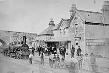The narrow gauge, horse-drawn Nantlle Railway had a station near the site from 1856. From the outset timetables appeared regularly in the "Carnarvon & Denbigh Herald"[9] and in Bradshaw from October 1856.[10] In 1865 the narrow gauge line was closed, to be replaced and updated to standard gauge with contemporary facilities. It reopened in its eventual form in 1867 and closed in December 1964. The station served as the junction station[11] for the short branch to Nantlle which was overlain in 1872 on part of the former Nantlle Railway route, but its main purpose was for traffic on the former Carnarvonshire Railway line from Caernarvon to Afon Wen and beyond.[12]
