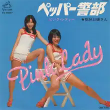 "Pepper Keibu" (ペッパー警部, Peppā Keibu, lit. "Inspector Pepper") is the debut single by the Japanese hit duo Pink Lady. The single was released on August 25, 1976, under the Victor label. "Pepper Keibu" reached a peak chart position of number four, with a total of 1,050,000 sales.[1] The titular song won the duo the Newcomer Award at the 18th Japan Record Awards. It was also nominated for the Best New Artist Award, but lost to "Omoide Boro Boro" by Yasuko Naitō.[2] The original recording did not have the signature "Pepper Keibu yo" at the end, as the live performances did. Subsequent recordings and covers do, however, include the line. A number of reissues have been made, including 8 cm and 12 cm CD versions.