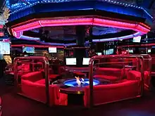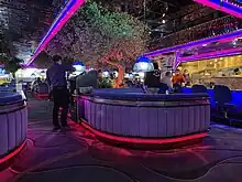 The Peppermill is noted for its retro 1970s appearance.[21][22][23] The interior features a blue and purple color scheme,[24][25][26] as well as neon lights, fake vegetation, and mirrored ceilings.[8][27] Tiffany lamps are hung above the tables and feature a flamingo design.[6][28]