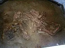 Though the entire skeleton was found, the bones were not in their proper place, evidently because the beast had been killed here by hunters, who had then dismembered it in order to eat it. The mammoth must have been 5 m long and 4 m tall. All that is missing is the tusks, which must have been taken away. The skeleton was accompanied by some 30 tools, mostly of quartz, which were used to cut the mammoth up and which came from other parts of the province of Eordaia.[1]