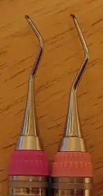 Gracey curettes are area-specific periodontal curettes made from stainless steel used to remove supra and subgingival calculus.[3][5] Along with universal curettes, Gracey curettes are one of the main instruments used for scaling and root planing. Gracey curettes are especially ideal for subgingival calculus removal because the design of the instrument allows for better adaptation to the anatomy of the roots.[3]