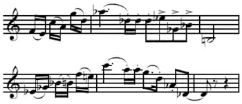 If the first three notes are regarded as the "original" cell, then the next 3 are its transposed retrograde-inversion (backwards and upside down), the next three are the transposed retrograde (backwards), and the last 3 are its transposed inversion (upside down).[5]