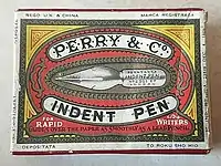James Perry, still a schoolmaster and being dissatisfied with the quality of existing pens, began making steel pens by hand. The firm was founded in Manchester as James Perry and Co. in 1824, but later moved to London, where they made and sold pens and pen-holders, pencils, elastic bands and ink, and dealt in stationers' supplies.[1] From 1829 all of Perry's pens were made by Josiah Mason, which was considered by the time as the finest pens manufacturer.[2] The excellence of their products swiftly raised them to the forefront of the new industry, exporting pens all over the world. By 1876 when the firm became a Limited Company, they equalled Esterbrook as being the largest manufacturers of pen nibs in the world.