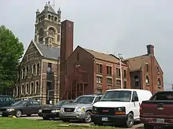 Located behind the courthouse is the old county jail, a three-story brick building.[6] Also constructed in 1887,[1] it succeeded the old courthouse as the jail; the 1857 courthouse included dedicated jail space on its first floor.[2]:57