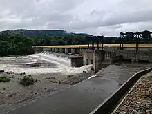 Perunthenaruvi Weir is a diversion dam built across Pamba river at villages of Naranammoozhy and Vechoochira in Pathanamthitta District of Kerala, India. Perumthenaruvi Small Hydroelectric Project 6 MW (2×3) is a run-of-the-river scheme in river Pamba, and the weir is a part of this scheme. This envisages the utilization of water from 442 km2 (171 sq mi) catchment of Pamba and Azhutha river for electricity generation under a net head of 18.00 m. The power house is located on the left bank of Pamba river. The weir is a concrete gravity type with a height of 10.93 metres (35.9 ft) and a length of 227.50 metres (746.4 ft). Taluks through which the release flow are Ranni, Konni, Kozhencherry, Thiruvalla, Chengannur, Kuttanadu, Mavelikara and Karthikappally.[1]