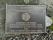 Bannister is commemorated by a plaque and kōwhai (Sophora microphylla) at the Department of Botany, University of Otago, planted on 26 February 2009, the first anniversary of his death.[3] The Peter Bannister Student Field Grant Award was first awarded in 2014 by the Botanical Society of Otago to assist postgraduate students with fieldwork.[8]