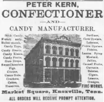 By the late 1860s, Kern had bought out Heidel's share, and had moved the business to a two-story building on Market Square.[1] During this period, Kern added an ice cream parlor (or "ice cream saloon") to his confectionery. The parlor utilized a three-horsepower ice cream machine designed by Market Square gunsmith Thomas Burrier.[1] Kern, who had to ship ice in from northern states during warmer months,[1] became a local expert on refrigeration, and served as president of the Knoxville Ice Company during the 1880s.[4][5]